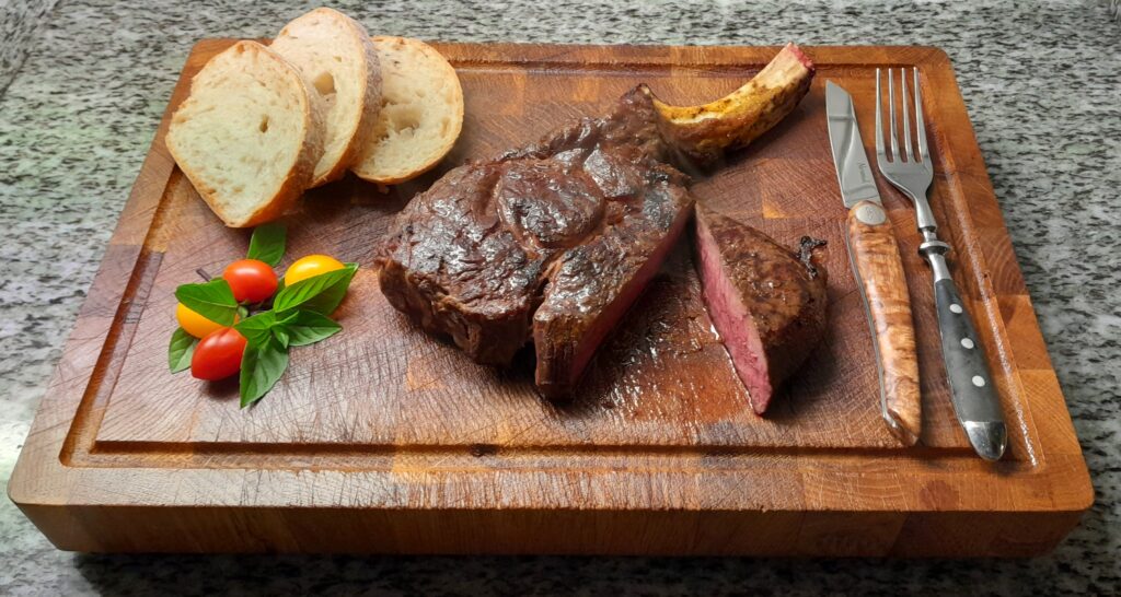 Das ist Hämps Startseite Kleiner Snack für zwischen durch Irisches Tomahawk aus Bio Haltung. 2 Stunden bei 54 Grad Sousvide gegahrt. Im Beefer bei 800 Grad 75 Sekunden pro Seite abgebrannt.